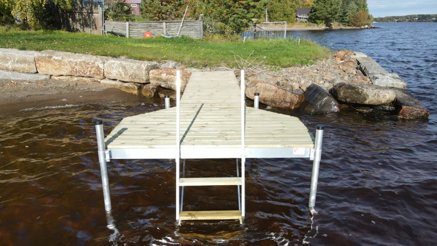 Kompakti T-mallinen pylväslaituri mökille. Kevyt alumiinirunko, säädettävät pylväät ja helppo käsitellä.